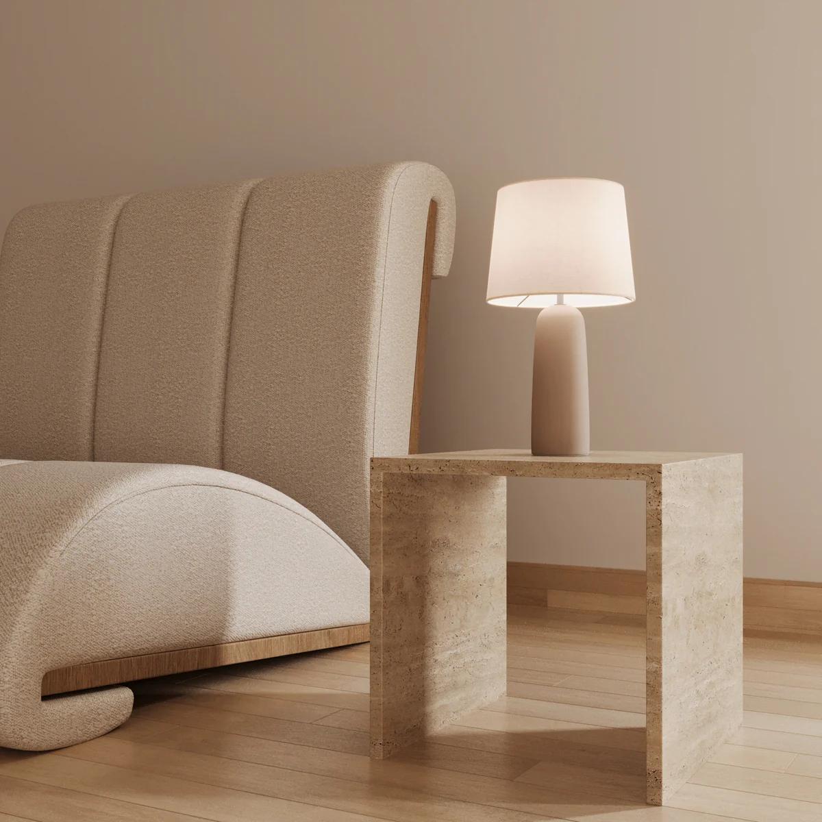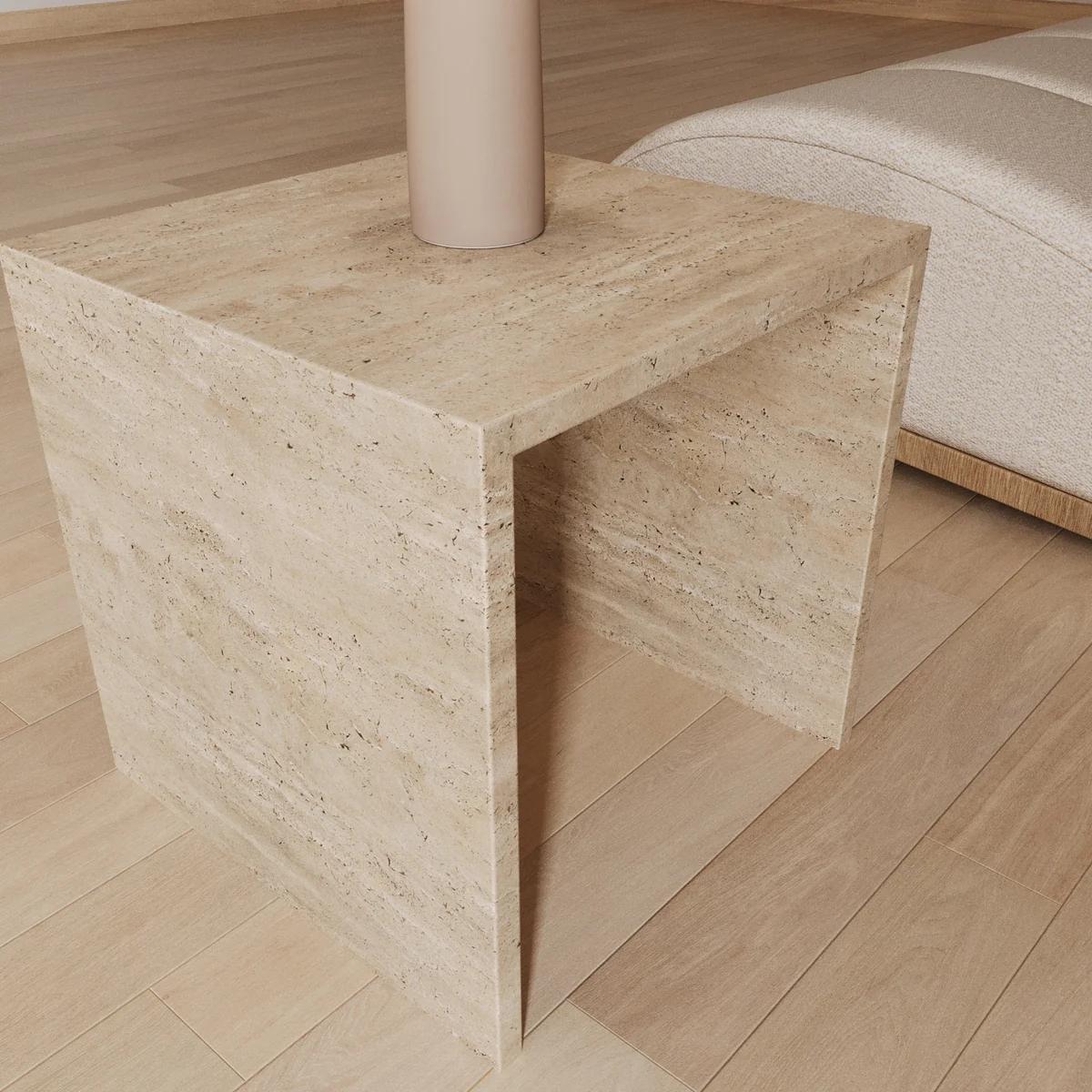 Chaque table de chevet est taillée dans un travertin véritable, une pierre aux tons chauds, connue pour ses nuances beiges, ses veinages subtils et ses cavités naturelles, parfois laissées apparentes ou rebouchées selon la finition choisie.